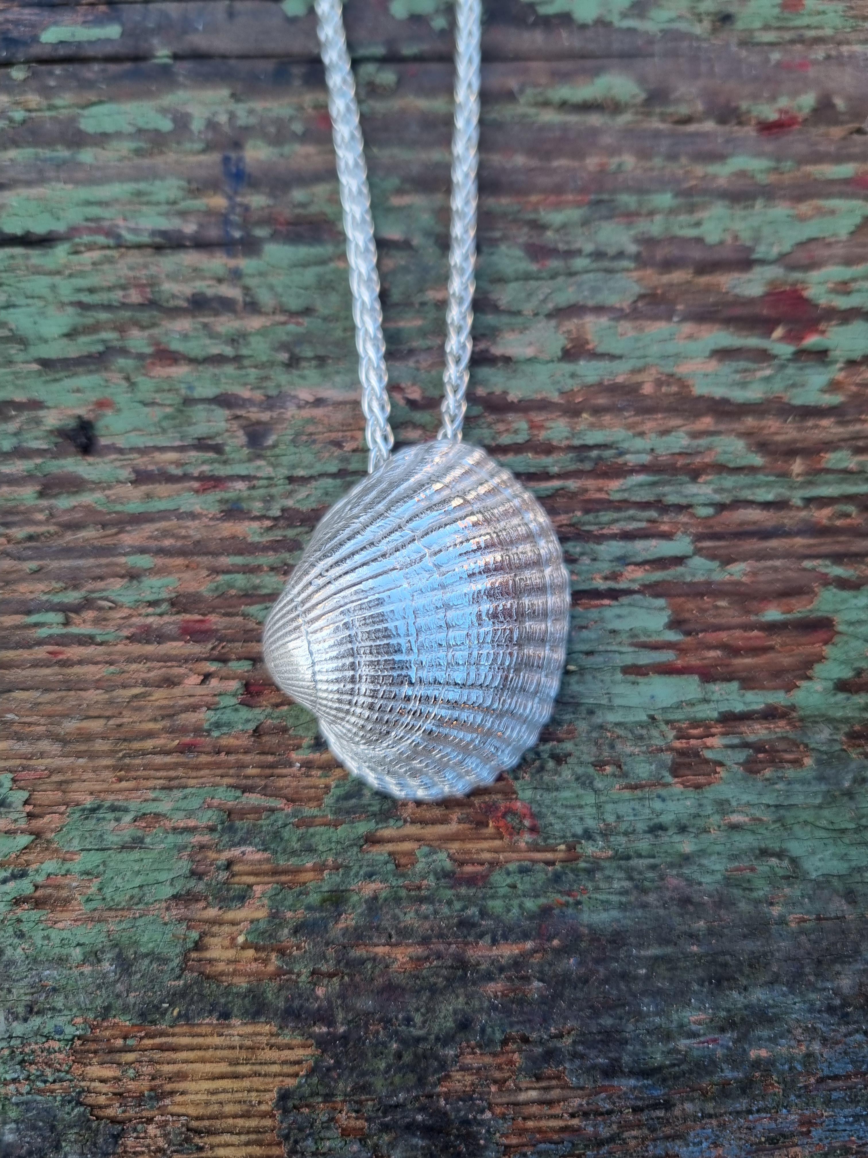 Nach gründlicher Reinigung entsteht in unterschiedlichen Arbeitsschritten der Abguss in Edelmetall. Nachdem Ösen und Stifte verlötet sind, wird die Oberfläche vorsichtig poliert, um die Muschelstruktur zu erhalten und zur Geltung zu bringen.