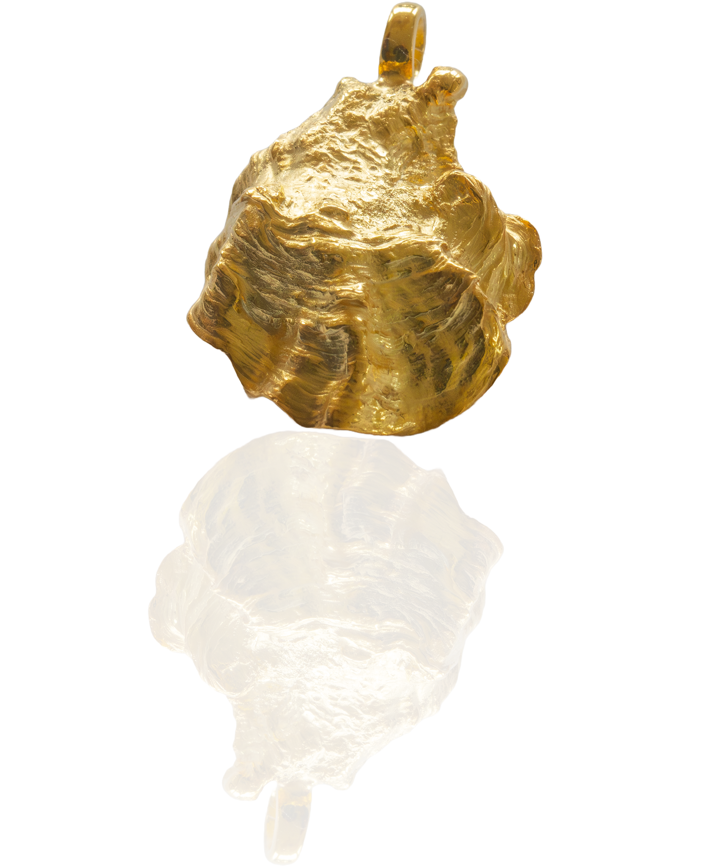 Nach gründlicher Reinigung entsteht in unterschiedlichen Arbeitsschritten der Abguss in Edelmetall. Nachdem Ösen und Stifte verlötet sind, wird die Oberfläche vorsichtig poliert, um die Muschelstruktur zu erhalten und zur Geltung zu bringen.
