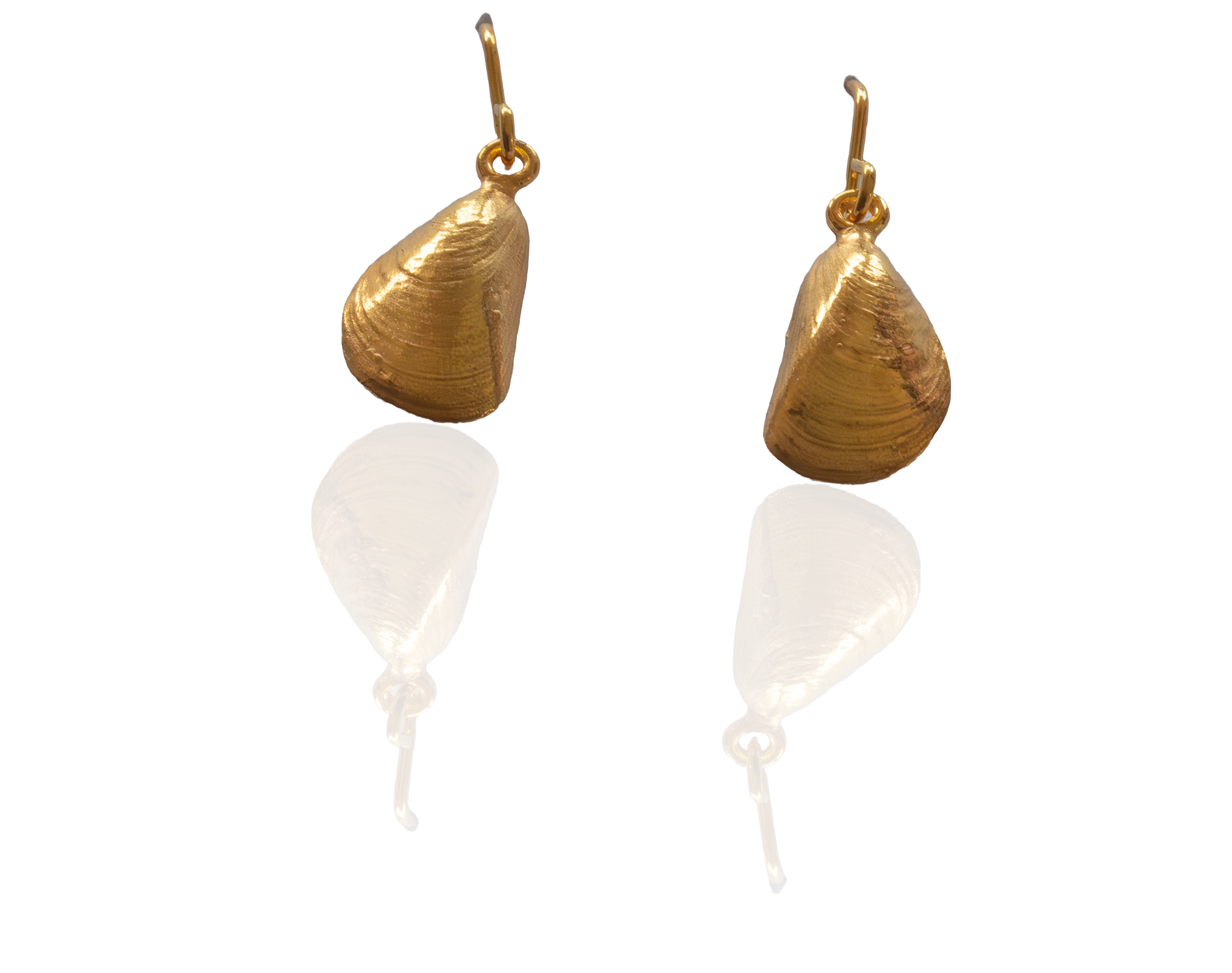 Nach gründlicher Reinigung entsteht in unterschiedlichen Arbeitsschritten der Abguss in Edelmetall. Nachdem Ösen und Stifte verlötet sind, wird die Oberfläche vorsichtig poliert, um die Muschelstruktur zu erhalten und zur Geltung zu bringen.