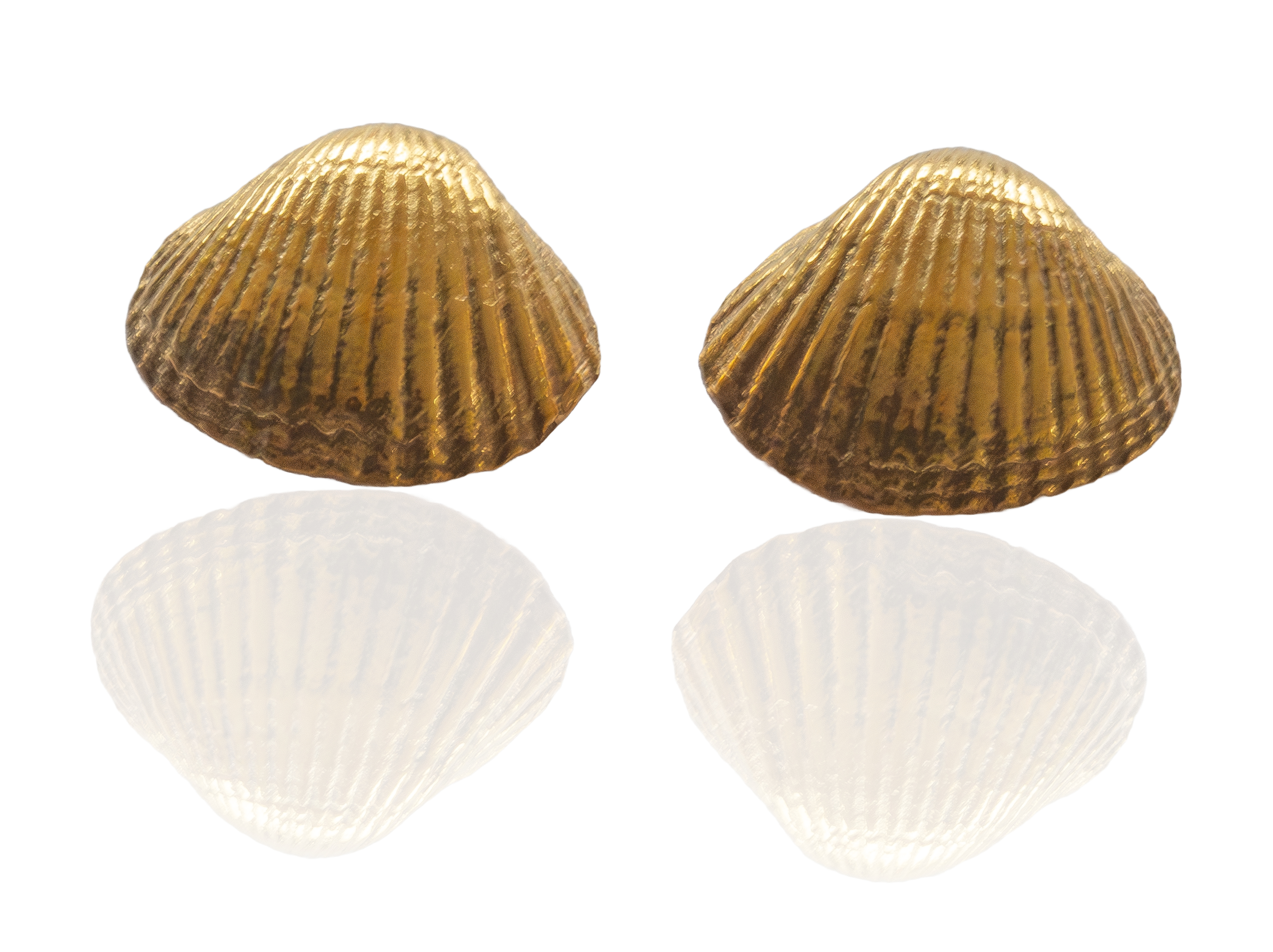 Nach gründlicher Reinigung entsteht in unterschiedlichen Arbeitsschritten der Abguss in Edelmetall. Nachdem Ösen und Stifte verlötet sind, wird die Oberfläche vorsichtig poliert, um die Muschelstruktur zu erhalten und zur Geltung zu bringen.